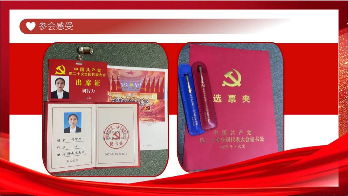 “作為一名海南離島免稅行業(yè)基層一線的青年黨員,能夠親歷這次具有重大里程碑意義的盛會(huì),我感到十分榮幸、也十分振奮。這是我第一次去到北京,第一次走進(jìn)人民大會(huì)堂。會(huì)議期間,我和海南代表團(tuán)其他24名參會(huì)代表,認(rèn)真聽取學(xué)習(xí)討論了黨的二十大報(bào)告?!眲⒅橇Ρ硎?,大會(huì)報(bào)告主題鮮明、內(nèi)容全面,擘畫的中國發(fā)展藍(lán)圖,特別是關(guān)于海南自貿(mào)港建設(shè)的部署,讓人倍感振奮。作為參與海南自貿(mào)港建設(shè)的一份子,劉智力表示,要做好黨的二十大精神的宣傳員,把黨的二十大“好聲音”送到大家的心坎上,同時(shí)做好黨的二十大精神的踐行者,把“誠信經(jīng)營、優(yōu)質(zhì)服務(wù)”理念融入到每一次對(duì)客服務(wù)中,讓每一位消費(fèi)者乘興而至、滿意而歸,在平凡崗位中為海南自貿(mào)港建設(shè)貢獻(xiàn)青春力量。