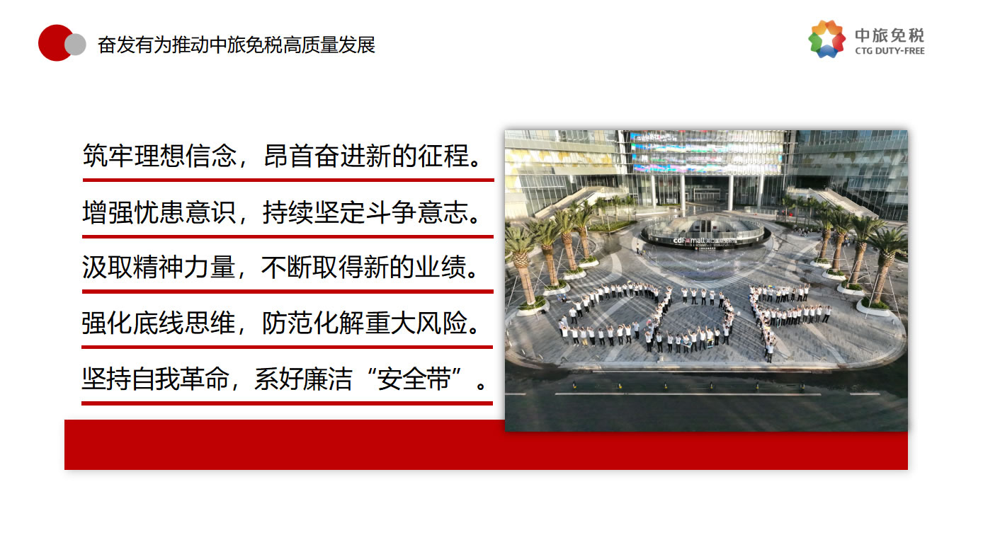 一是筑牢理想信念,昂首奮進(jìn)新的征程。要堅決貫徹落實總書記指示,優(yōu)化發(fā)展方式,注重發(fā)展品質(zhì),追求質(zhì)量更優(yōu)、效益更好、效率更高的可持續(xù)增長,做強(qiáng)做優(yōu)公司核心競爭優(yōu)勢,全面提升公司經(jīng)營發(fā)展的系統(tǒng)能力。二是增強(qiáng)憂患意識,持續(xù)堅定斗爭意志。要進(jìn)一步強(qiáng)化危機(jī)意識、憂患意識,主動擔(dān)責(zé)、主動擔(dān)難、主動擔(dān)險,以強(qiáng)烈的使命感和責(zé)任感,統(tǒng)一思想、統(tǒng)一意志、統(tǒng)一行動。三是汲取精神力量,不斷取得新的業(yè)績。要以“紅色引擎 免稅先鋒”“海棠精神”“紅帆工程”等黨建品牌活動為切入點,進(jìn)一步提升基層黨組織的組織力,通過共建活動平臺、分享工作資源、交流工作經(jīng)驗、解決實際問題等途徑,實現(xiàn)黨的建設(shè)與業(yè)務(wù)發(fā)展建設(shè)良性互動,以深入推進(jìn)全面從嚴(yán)治黨引領(lǐng)保障高質(zhì)量發(fā)展。四是強(qiáng)化底線思維,防范化解重大風(fēng)險。要深刻領(lǐng)會習(xí)近平總書記關(guān)于強(qiáng)化底線思維,防范化解重大風(fēng)險的重要論述,充分認(rèn)清當(dāng)前面臨的形勢任務(wù),系統(tǒng)梳理查找存在的突出風(fēng)險問題,自覺從習(xí)近平新時代中國特色社會主義思想中找到破解矛盾問題的鑰匙,努力在新思想指引下探索推動高質(zhì)量發(fā)展的路徑。五是堅持自我革命,系好廉潔的“安全帶”。要繼續(xù)發(fā)揚自我革命精神,縱深推進(jìn)黨風(fēng)廉政建設(shè)和反腐敗斗爭,一體推進(jìn)“不敢腐、不能腐、不想腐”,圍繞財經(jīng)領(lǐng)域?qū)m椪蔚戎攸c問題、緊盯海南地區(qū)所屬的重點企業(yè)和重點項目,以及防范離島免稅“套代購”、傳統(tǒng)渠道免稅店經(jīng)營風(fēng)險等重點領(lǐng)域和巡視整改等重點工作,深化標(biāo)本兼治、系統(tǒng)治理,以新時代廉潔文化建設(shè),涵養(yǎng)求真務(wù)實、團(tuán)結(jié)奮斗的中免風(fēng)貌。