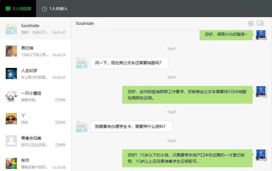 8月份升級(jí)開(kāi)通網(wǎng)絡(luò)人工客服,市民通過(guò)荊門公交微信公眾號(hào),與人工客服1號(hào)、2號(hào)坐席進(jìn)行溝通,建立起集咨詢、尋物、建議、投訴等一體化的綜合在線服務(wù)。