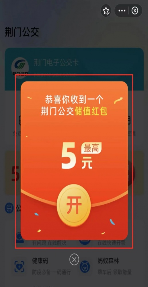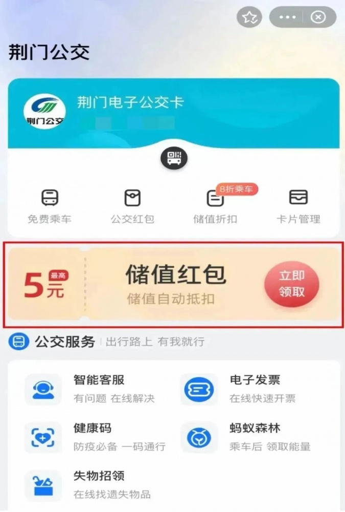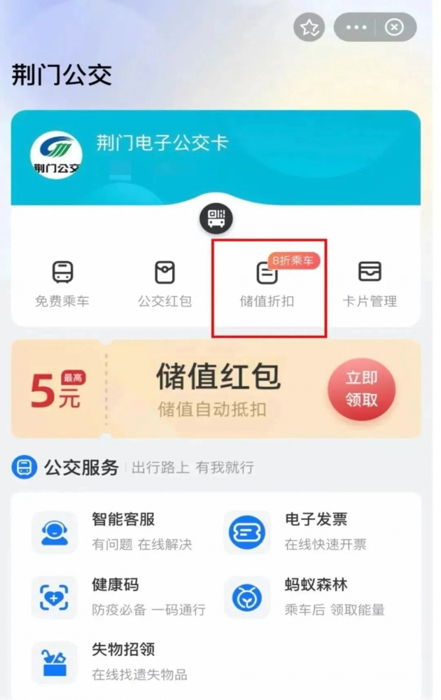 02點(diǎn)擊“荊門公交”,領(lǐng)取“儲(chǔ)值紅包"后點(diǎn)擊【去優(yōu)惠充值】,完成優(yōu)惠儲(chǔ)值