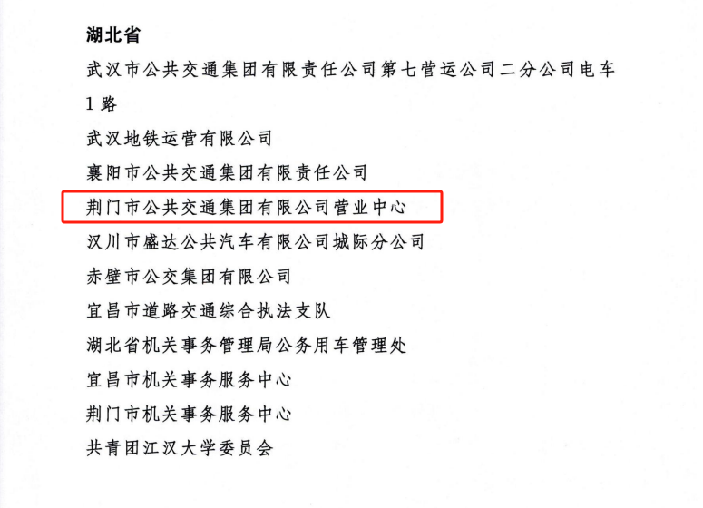 近日,交通運(yùn)輸部、公安部、國家機(jī)關(guān)事務(wù)管理局、中華全國總工會(huì)、共青團(tuán)中央聯(lián)合發(fā)出《關(guān)于表揚(yáng)2023年綠色出行宣傳月和公交出行宣傳周活動(dòng)成績突出集體和個(gè)人的通報(bào)》。其中,荊門市公共交通集團(tuán)有限公司營業(yè)中心被評(píng)為活動(dòng)成績突出集體,荊門市公共交通集團(tuán)有限公司羅莎被評(píng)為活動(dòng)成績突出個(gè)人。