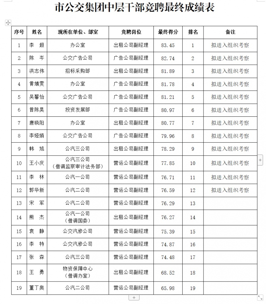 經(jīng)報名、資格審核、筆試、面試等環(huán)節(jié),共有12名競聘者(最終得分前12名)進(jìn)入組織考察環(huán)節(jié),現(xiàn)將最終成績公示如下(見附件)。
