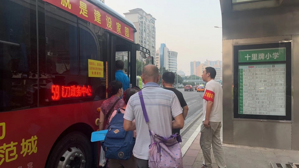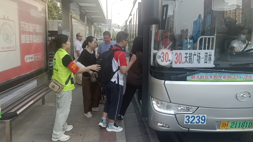 開學(xué)當天,人流大、車輛多,在城區(qū)各個學(xué)校附近,公交志愿者身穿綠馬甲或是佩戴安全袖章,守候在關(guān)鍵路口、站臺和斑馬線,面帶笑容引導(dǎo)學(xué)生安全出行。
