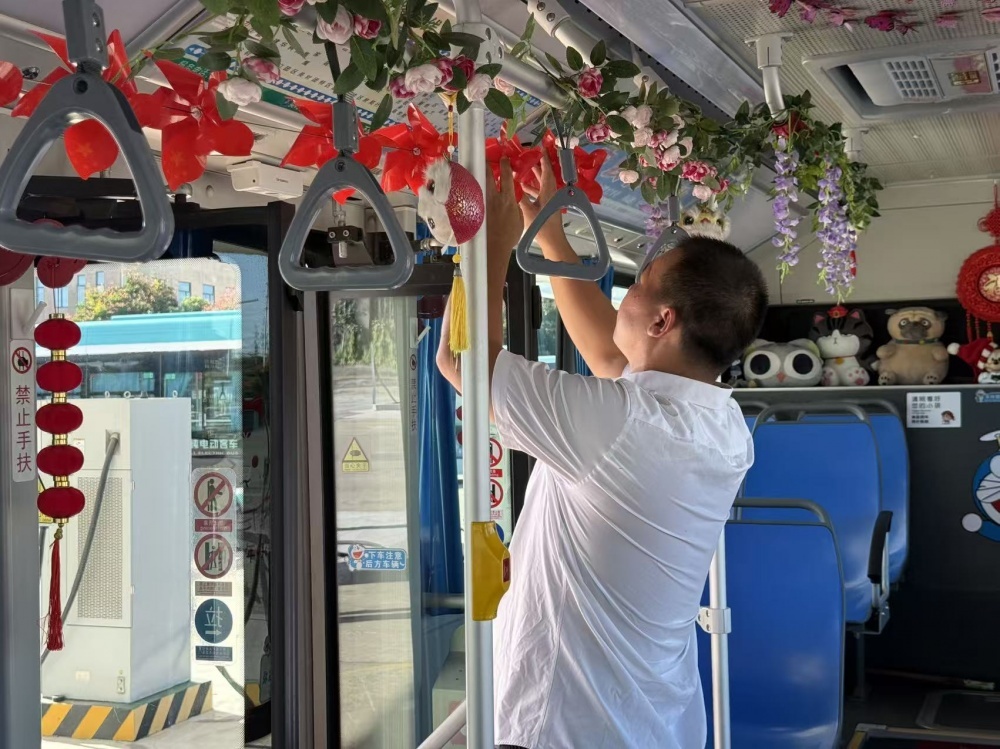 張峻峰是荊門公交2024年度“最美公交人”,他的車上總比別人多點(diǎn)“暖心”東西:駕駛座旁的小盒子里備著暈車藥、創(chuàng)可貼和折疊傘?!敖衲陣鴳c,就想乘客上車能樂呵樂呵。”于是張峻峰就動了裝飾車廂的念頭。他自費(fèi)買了小國旗、風(fēng)車、燈籠等裝飾,晚上在家剪剪貼貼,白天利用休息時間在車上裝飾。張峻峰的行動,也是荊門公交服務(wù)提升的一個縮影。