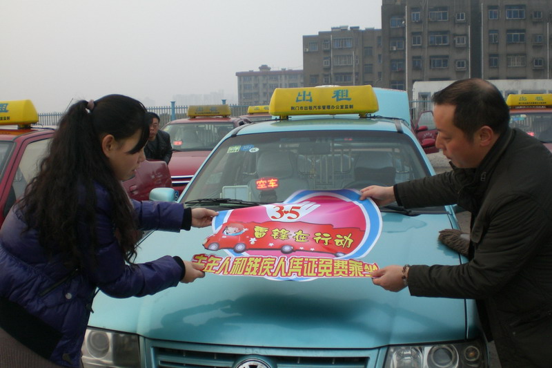 昨日7時30分,市出租汽車公司雷鋒車隊的20臺雷鋒車和20臺優(yōu)秀出租汽車匯集到泉口一路市出租汽車公司院內(nèi),統(tǒng)一粘貼心形的"3-5雷鋒在行動""老年人和殘疾人免費乘坐"活動標識(如圖),經(jīng)過簡短的啟動儀式后,駕駛員們整裝出發(fā),在城區(qū)運行,對老年人、殘疾人和到醫(yī)院就醫(yī)但行動不便的病人實行免費接送服務(wù)。
